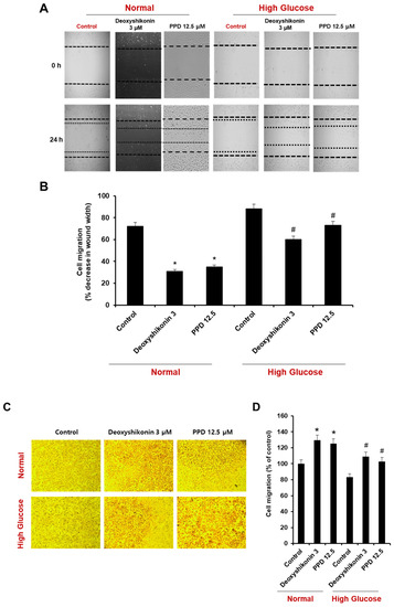 Effects of deoxyshikonin and PPD on scratch wound healing in HUVECs. (A) Scratch wound healing in HUVECs was evaluated using a cell-scratch wound healing assay. Images of the same location were captured at 0 and 24 h after wounding. (B) Scratch wound healing of the deoxyshikonin- or PPD-treated HUVECs was detected using the scratch wound healing assay. (C) Cell migration of deoxyshikonin or PPD-treated HUVECs for 24 h in normal media or high-glucose media. (D) Quantification of migration was calculated as a percentage of the cell density by ImageJ software. Data are presented as the mean ± standard deviation (SD) of three independent experiments. * p < 0.05 compared to the control in normal, # p < 0.1 compared to the control in high glucose.