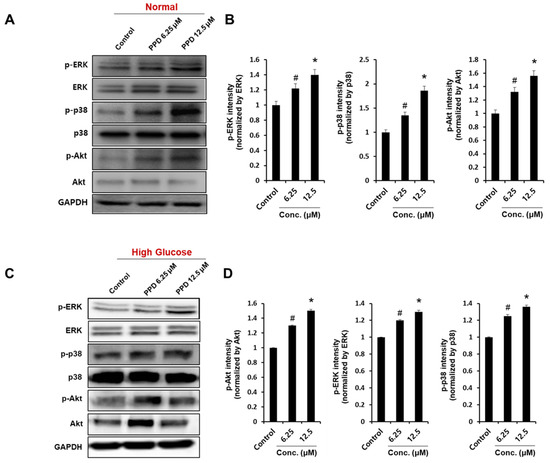 Effects of PPD on angiogenic protein expression in HUVECs. Cells (8 × 105 cells/6-cm dish) were cultured in normal media or high-glucose media. (A,C) Cells were treated with PPD at indicated concentration under normal condition or high glucose condition for 24 h. Whole-cell lysates were immunoblotted with the specific antibodies indicated on the left side of each panel. The level of GAPDH was measured as internal loading control. (B,D) p-ERK, p-p38, and p-Akt protein levels were quantified by total protein using the ImageJ software. Data are presented as the mean ± standard deviation (SD) of three independent experiments. * p < 0.05 and # p < 0.1 compared to the control.