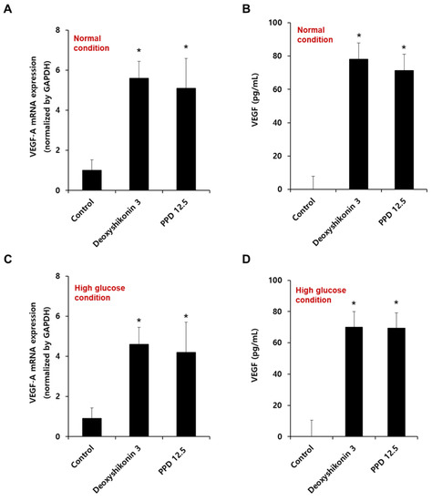 Effect of PPD on the mRNA expression and cytokine production of VEGF in HUVECs. (A,C) Cells (8 × 105 cells/6-cm dish) were stimulated with deoxyshikonin (3 μM) or PPD (12.5 μM) for 12 h under normal or high glucose conditions. The mRNA expression of VEGF-A was checked using qRT-PCR with specific VEGF-A primers. Deoxyshikonin (3 μM) was used as a positive control for VEGF-A gene expression. GAPDH gene was used as a housekeeping gene for normalization. (B,D) Cells were stimulated with deoxyshikonin (3 μM) or PPD (12.5 μM) for 24 h in normal or high glucose conditions. The cell supernatant was collected, and VEGF secretion was measured by a commercial ELISA kit. Data are presented as the mean ± standard deviation (SD) of three independent experiments. * p < 0.05 compared to the control.