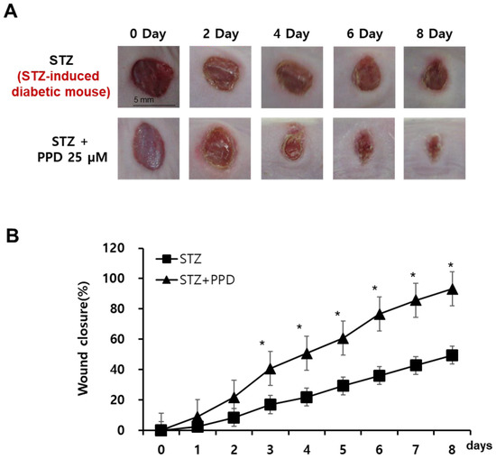 Effect of PPD on wound healing in an experimental mouse model with skin wound. (A) Comparison of wound closure between the two groups (mice treated with 25 μM PPD and those in the control group). Representative pictures of wounds at 0, 2, 4, 6, and 8 days after treatment. Scale bar, 5 mm. (B) Quantitative analysis of the wound size in the PPD treatment groups compared to that in the control group. Data are presented as the mean ± standard deviation (SD) of three independent experiments. * p < 0.05 compared to the STZ group.