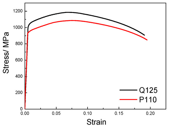 The casing materials studied in this paper are P110 and Q125 steels, and the sizes are φ127 × 11.1 mm and φ139.7 × 12.7 mm, respectively. The yield strength of P110 is 935.3 MPa, and the yield strength of Q125 is 1014.9 MPa. The true stress and strain curves of P110 and Q125 are shown in Figure 1. In this paper, the method of combining full size test and finite element simulation was used to study the deformation of casing–cement sheath under the action of non-uniform external extrusion and shear, and the load and minimum drift diameter were analyzed. Based on ABAQUS 6.11 software, sourced from CNPC Tubular Goods Re-search Institute, Xi’an, China, P110 (φ127 × 11.1 mm) and Q125 (φ139.7 × 12.7 mm) casing shear deformation were conducted by finite-element simulation. Both ends of the cement sheath and casing were fixed, which was consistent with the actual downhole working conditions. Due to the symmetry of the model, one half of the whole model was taken as the calculation model in this paper. Under the condition of formation slip, the minimum drift diameter of the casing–cement sheath system under the action of shear force could be calculated. The influence of the friction coefficient on the minimum drift diameter has been studied, and the effect was very small. In addition, in the actual shear tests, the load–displacement curves under different lubrication conditions showed little change, and this was consistent with the simulation results. Therefore, the friction coefficient was set to the conventional 0.2. For the casing, the Von Mises yielding criterion and isotropic hardening law were adopted.