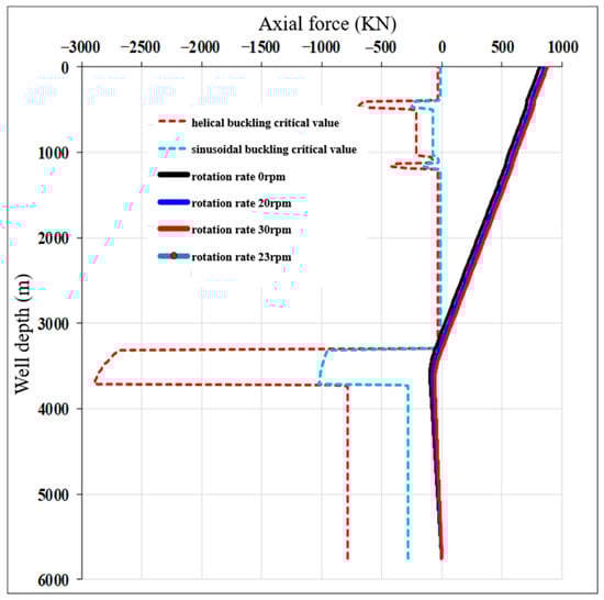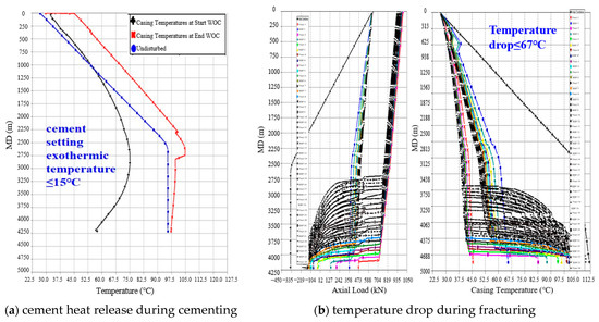 A large amount of casing deformation occurs in the complex fracturing process of shale gas wells, which adversely affects the fracturing operation of shale gas wells and the productivity of single wells. First of all, based on the strength theory, the use safety of the casing is analyzed. Under the casing running condition, when the rotating speed is 20~30 rpm, it can eliminate buckling deformation of casing under inertia casing mode; also, the axial force on the casing meets the strength requirements, as shown in Figure 2. In the process of cementing, cement hydration exothermic heat leads to an increase in temperature, and the exothermic temperature under different well depths is calculated numerically to be less than or equal to 15 °C, as shown in Figure 3. Under fracturing condition, considering the wellbore temperature alternation caused by fracturing fluid, the temperature drop values are calculated by numerical method, which is less than or equal to 67 °C. Considering the above three working conditions in the whole process of cementing fracturing, the safe service margin of the casing is large, so the strength of the casing can fully meet the operating requirements.