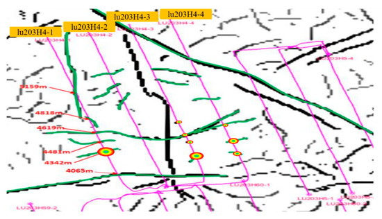 Based on the statistical analysis of casing deformation wells and caliper logging interpretation, the morphological characteristics of casing deformation can be obtained, and the main controlling factors of casing deformation in deep shale gas wells are revealed, which can provide a research basis for deformation prevention. Figure 4 shows a typical casing deformation logging morphology, indicating that uneven extrusion deformation occurs in many segments, while shear morphology is shown in the transition zone between deformation and non-deformation or extrusion deformation [11,12]. In addition, during multi-stage fracturing, it is easy to cause the activation of faults, leading to local formation slip, which causes the casing to bear huge shear loads and deformation [13]. As shown in Figure 5, the casing deformation locations are mainly concentrated in the horizontal section (close to point A), and the coincidence rate between casing deformation locations and faults/fractures is high. For example, the coincidence rate between casing deformation locations and faults/fractures of four wells in the Luzhou 203H4 platform exceeds 80%. Therefore, according to the logging data and analysis of complex fracturing casing deformation in shale gas wells, it is determined that the casing deformation modes are mainly non-uniform extrusion dominated, shear dominated, or the composite morphology, and it is determined that the main controlling factor of casing deformation in deep shale gas wells is formation slip.