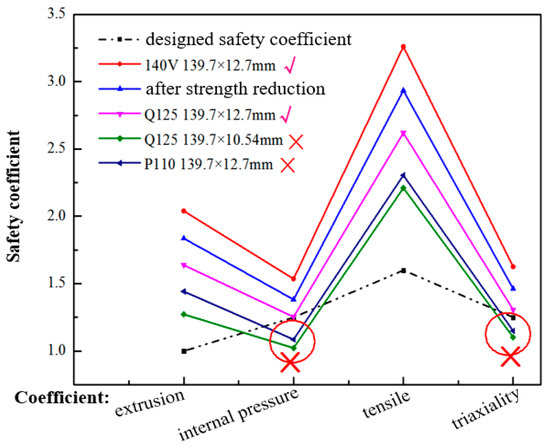 Figure 6 shows the verification results of production casing string, for the casing of Q125, φ139.7 × 12.7 mm, the anti-collapse coefficient, anti-internal pressure coefficient, tensile coefficient, and triaxial coefficient of the casing are greater than the design safety coefficient, meeting the strength requirements of the casing. When the casing steel grade is increased from Q125 to 140 V, the safety coefficient of the casing is greatly increased, and the anti-collapse coefficient reaches about 2.0, which is far greater than the design one, but the effect of increasing the steel grade to prevent casing deformation is not obvious. For the casing body, when the wall thickness increases from 12.7 mm to 15.2 mm, the statistical results of engineering test wells show that the casing deformation rate is also more than 50%. Therefore, simply increasing casing steel grade and wall thickness have no obvious effect on casing deformation prevention in deep shale gas horizontal wells, so it is necessary to consider casing deformation prevention measures for the whole wellbore.