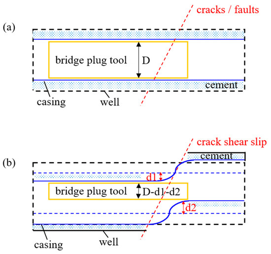 Under large formation slip, casing deformation occurs due to shearing or non-uniform extrusion, which seriously affects the running and trafficability of bridge plug tools. As shown in Figure 7, due to fault slip, the bridge plug diameter changes from D to (D-d1-d2). Therefore, it is necessary to study the minimum diameter of the casing cement sheath after deformation.