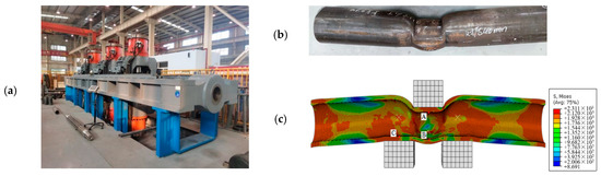 Shear tests are conducted on Q125 (φ139.7 × 12.7 mm) casing. For the 800 mm long Q125 casing, the “unconventional oil and gas well casing string simulation test system” is used for the shear test. A Vernier caliper is used to measure the diameter in the pressure direction and vertical direction at 1/2 position of the pipe body, and an ultrasonic thickness gauge is used to measure the wall thickness of four points evenly distributed on the circular ring of the cross section. The maximum shear load after 40 mm shear is 2850 KN. The casing morphology after the shear test is shown in Figure 8. Figure 8a is the indoor test equipment diagram, Figure 8b is the tube blank diagram after 40 mm shear deformation; the minimum diameter after the test measured by Vernier caliper is 109.74 mm, and the corresponding pipe inner diameter is 83.34 mm (i.e., Section AB in Figure 8c, 109.74 − 12.7 × 2 = 84.34 mm). Since the minimum diameter can not be directly measured in the test, the method of combining the test with numerical simulation is adopted here. Figure 8c shows the cloud diagram of equivalent stress distribution for finite element simulation of the pipe body after 40 mm shear deformation; where the casing ends are fixed, half of the model is calculated due to structural symmetry, and the hexahedral grids are used. For the casing, the Von Mises yielding criterion and isotropic hardening law are adopted. Then the minimum diameter is calculated, that is, the radial distance AB from the top to the bottom of the upper shear fixture, minus the radial distance BC from the bottom to the top of the lower shear fixture; the minimum diameter is 80.51 mm (85.89 − 5.38 = 80.51 mm), and the deformation is 33.79 mm. Comparing the length value of the AB section in the test and simulation, the error is 1.8% ((85.89 − 84.34)/84.34 × 100% = 1.8%), which proves the reliability of the finite element model. Using the method of combining test with numerical simulation, the minimum path under different test parameters can be calculated, providing data support for the analytical model of bridge plug trafficability.