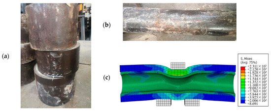 Casing deformation morphology after 40 mm shear deformation: (a) test equipment; (b) test morphology; (c) equivalent stress distribution diagram of finite element simulation.
