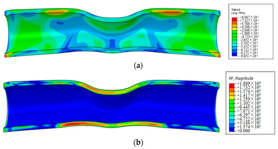 When the elastic modulus is 9 GPa, H1 is 86.84 mm, H2 is 4.76 mm, and Hmin is 82.08 mm. The deformation of minimum drift diameter ΔH is 32.22 mm. The displacement distribution after 40 mm shearing is as shown in Figure 10a. Due to the protective effect of the cement sheath, the displacement of the casing part in contact with upper die is about 18 mm. The maximum equivalent plastic strain of the casing is located at the transition zone of the upper and lower molds, and the maximum value is 0.44 (Figure 10b). After 40 mm shearing deformation, the stress triaxiality of the casing is as shown in Figure 11a. The casing parts contacting the upper and lower dies are compressive stress, and the stress triaxiality at the lower die is the minimum, −0.98. The maximum stress triaxiality is located near the upper die. The casing arches upward in the tensile stress state, and the stress triaxiality is 0.89. The load distribution is shown in Figure 11b; the casing contacting the upper and lower shear dies is subjected to the maximum load of 1889 KN.