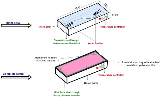 Two different drying methods were used to dry freshly-made onion puree: refractance window drying (RWD) and convective drying (CD). At 50 °C, the CD was performed in a Kilburn tray dryer (Macheill and Magor Ltd., Kolkata, India). At a water temperature of 70 °C, the RWD experiment was conducted in a batch-type pilot-scale dryer of size 1.8 m × 1.2 m × 0.15 m, developed at the Department of Processing and Food Engineering, Punjab Agricultural University, Ludhiana, India (Figure 1). For experimental purposes, the onion puree was equally spread in 2 mm-, 4 mm-, and 6 mm-thick layers in the prefabricated trays of the convective dryer and sample tray of the RW dryer. The bottom part of the trays used for RWD had metalized polyester film for the transmittance of heat from the water to the onion puree. The RW dryer consists of an insulated water bath attached with two electrical heaters (1 kW and 2 kW) for heating water, and a thermostat for regulating water temperature. The drying of onion puree was maintained until weight loss became consistent. The initial and final weights of the products were determined. The dried flakes were further ground to form a powder using a grinder (Dynamix DX, Sujata, New Delhi, India), which was passed through a 212 μm sieve for uniformity of size.
