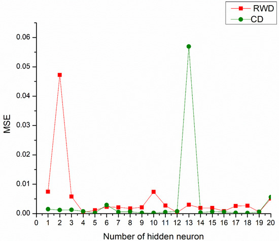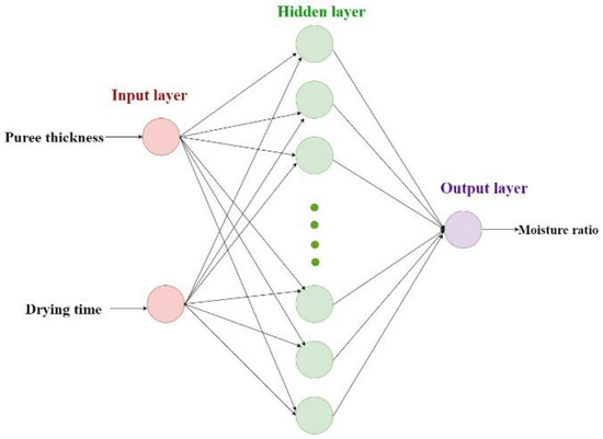MATLAB software (R2018a, MathWorks, USA) was used to develop and test different ANN models to predict MR during RWD and CD of onion puree. A multi-layer feed-forward (MLF) algorithm with back-propagation learning was selected. This algorithm uses a supervised training method that initializes the biases and weights at random. Typically, multilayer feed-forward nodes have three layers (input/hidden/output). The ANN was fed two input variables (thickness of puree and time of drying) and one output variable (MR) (Figure 2). The experimental statistics were shuffled before being divided into subgroups for training, validation, and testing. In addition to gradient estimation, training network weights and biases were estimated using 70% of the data, while 15% of the data were used to evaluate the network and 15% of the data were used to test the network. In this study, Tansig was used as the network transfer function, and Levenberg–Marquardt was used as the training function [42]. To build the best ANN model, the number of neurons in the hidden layer was calculated by trial and error. As a final step, three statistical criteria were used to evaluate the performance of the ANN model: mean square error (MSE), RMSE, and correlation coefficient (R).