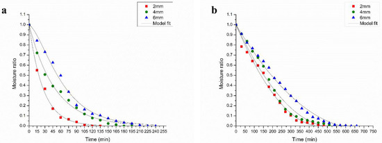 Moisture ratio vs time with best-fit model line: (a) RW dryer and (b) convective dryer.