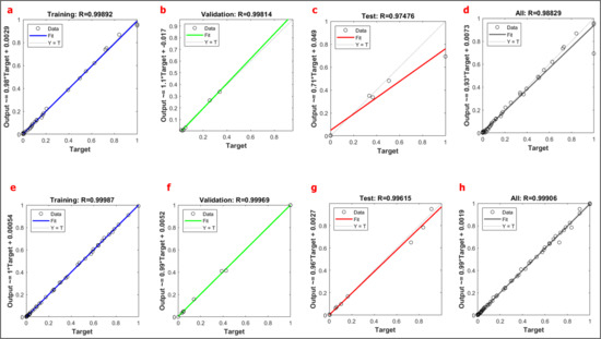 Regression plot obtained using ANN: (a–d) RW dryer and (e–h) convective dryer.