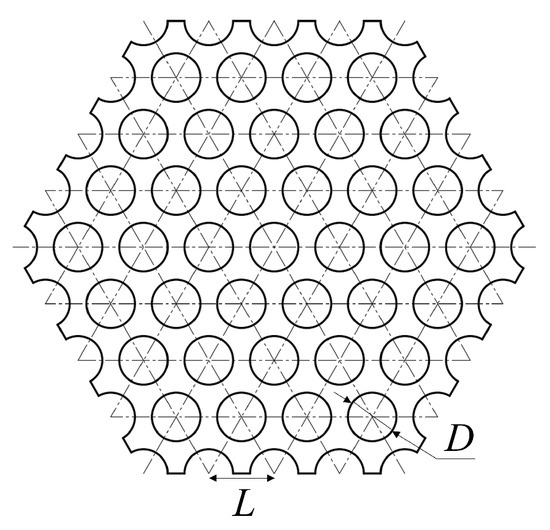 where subscript s denotes the solid, is the surface area density, and h is the heat transfer coefficient for the interface between the fluid and the solid. The shape of the checker brick used in this study is represented in Figure 2. The hole diameter D is 52 mm, and the distance between the holes L is 78 mm. The porosity and the surface area density were calculated with the following equations.