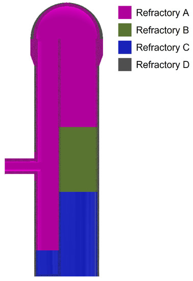 The types and applied areas of the refractory linings are described in Figure 5. The apparent density, thermal conductivity, and thermal expansion coefficient of each refractory are given in Table 3. The specific heat capacity of the alumina checker brick was used for Refractories A, B and C. For Refractory D, the specific heat capacity of fireclay checker brick was applied. The elastic modulus and Poisson’s ratio of the refractories were set as 4 GPa and 0.15 [45], respectively. The material properties of the refractories were found in the sources [39,45,46] and the catalogues from Chosun Refractories. The shell material was AISI 420 stainless steel with a thickness of 30 mm. Its material properties were obtained from Simufact MatILDa.