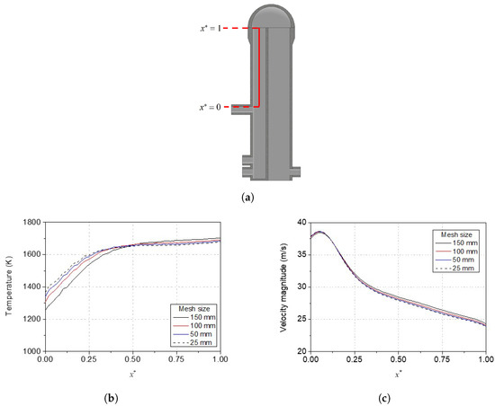 A grid dependence test was conducted to determine the adequate mesh size for the CFD analysis. Temperature and velocity magnitudes in the middle of the on-gas period were compared with different mesh sizes. Temperature and velocity magnitudes were extracted from the centre of the combustion chamber, as shown in Figure 6a where denotes the normalised height. The grid dependence was tested for the mesh sizes of 150 mm, 100 mm, 50 mm and 25 mm. Figure 6b,c show the temperature and velocity profiles of the tested mesh sizes. The temperature and velocity magnitude profiles with the 50 mm mesh size had 0.55% and 0.35% average differences from the 25 mm mesh size, respectively. Considering the accuracy and computational burden, the 25 mm mesh size was selected to generate the mesh for the CFD analysis. The mesh for the CFD analysis was generated with 2,874,424 cells, as shown in Figure 7a.