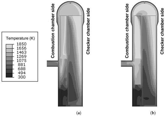 The velocity profile of the fluid and the temperature profiles of the fluid and checker bricks in the middle of the on-gas period ( min) are presented in Figure 8. The maximum temperature reached 1841 K in the on-gas period. During the on-gas period, the velocity profile in the combustion chamber increased to 38.8 m/s at maximum and subsequently decreased to 22.8 m/s at the entrance of the dome due to the cross-sectional area change. A vortex was generated in the centre of the dome while the main flow passed through the outer region of the dome. The vortex caused the main flow to occur through the outer region of the checker chamber. Meanwhile, the inner section of the checker chamber could not absorb the heat from the flue gas due to a lack of flow, even though the vortex temperature was high enough. The external combustion hot blast stove also shows the vortex, but it is located at the top of the checker chamber dome [12]. The dome combustion type has the vortex between the top of the checker bricks and the dome [7,9]. The cause of the vortex generation is the sudden expansion of the flue gas discharged from the combustion chamber [7]. The major difference between the internal combustion type and the other types was the location of the vortex, which disturbed the flow to the inner section of the checker chamber. As a result, the temperature profile of the checker chamber, which is presented in Figure 8c, had an elevated temperature region in the outer region of the checker chamber, which showed a high temperature difference in the horizontal direction. External and dome combustion types do not have a high temperature difference in the horizontal direction since the generated vortex does not interfere with the fluid flow to the checker bricks.