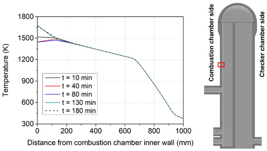 Figure 11 depicts the temperature change in the marked region of the combustion chamber wall through the thickness direction during the operation. The region was exposed to the most fluctuating temperature during the operation. The inner surface of the refractory had a temperature change from 1441 K to 1659 K. However, the temperature change reduced below 10 K from 250 mm from the inner surface and vanished at the outer surface. Similar behaviour also showed in the external combustion hot blast stove [12]. The length scale for thermal diffusion can be estimated as where is the thermal diffusivity, and is the time scale. Taking Refractory A in Table 3 as an example material to compute the length scale for the thermal diffusion, its thermal diffusivity at 1000 °C is 0.875 mm2/s. Its length scale for thermal diffusion is calculated as 97.2 mm with the time scale of min, which is the operation time for a cycle. The structure temperature analysis results indicated that the temperature difference vanished from 250 mm, which makes the FEA result considered to be reasonable. The shell temperature, therefore, remained steady during the operation thanks to the low thermal diffusivity of the refractories.
