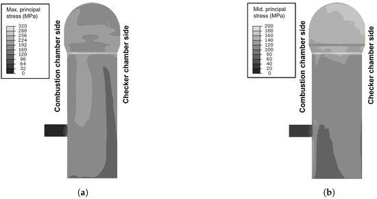 The maximum and middle principal thermal stress distributions of the shell are illustrated in Figure 13. It is observed that both principal stresses appeared to be higher along the conical region, which was induced by not only the thermal gradient discussed but the geometric characteristics that can raise the stress concentration. However, the external combustion type was reported to have tensile maximum principal stress, and compressive minimum principal stress in the conical region [12], while the internal combustion type had biaxial tensile stress. The conical region in the external combustion hot blast stove has a relatively uniform temperature distribution. Since the thicker part has lower temperature distribution than the thinner part of the conical region, the thinner part tends to expand more than the thicker part. As a result, the conical region of the external type has compressive minimum principal stress, whilst the internal combustion type showed uneven temperature distribution, which generated the tensile minimum principal stress on the conical region of the internal type. An intermediate level of the maximum principal stress was observed on the partition wall side compared to the combustion and checker chamber sides. The stress on the partition wall side was induced due to the temperature gradient in the circumferential direction. The combustion, checker chambers, and partition wall sides had a similar level of middle principal stress since the thermal gradient in the height direction did not differ when compared to the circumferential direction. The maximum principal stress of the dome appeared to be higher in the region near the partition wall side, where a higher thermal gradient was generated.