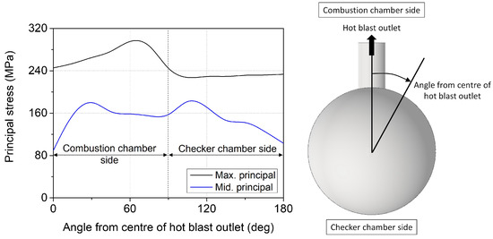 Figure 14 describes the maximum and middle principal thermal stresses of the conical region along the circumferential direction. The highest maximum principal stress occurred at the 65° point, where the low-temperature area of the conical region was as discussed previously, and its magnitude was 300.6 MPa. The combustion chamber side had higher maximum principal stress distribution than the checker chamber side. A higher middle principal stress appeared in the angle region between 30° and 120°. The highest middle principal stress occurred with 192.0 MPa at the 30° and 105° points. However, the external combustion type has the maximum principal magnitude of 53 MPa [12]. Even though the region which has the highest maximum principal stress is the same in both types, the internal type had about three times higher maximum principal stress. It can be understood that temperature variation is a dominant factor for the generation of thermal stress in hot blast stove applications.
