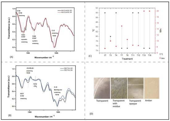 Chemical composition of hydrocolloids and agar substitute stability obtained from O. ficus-indica and O. robusta. (A) FTIR spectra of mucilage obtained from O. ficus-indica and O. robusta (B) FTIR spectra of pectin obtained from O. ficus-indica and O. robusta. (C) Temperature and minutes to the gel of designed formulates. CT control treatment. (D) Photographs of plates with agar gels with different colors. A catalog of colors was made with experimentation with Opuntia hydrocolloids (pectin and mucilage).
