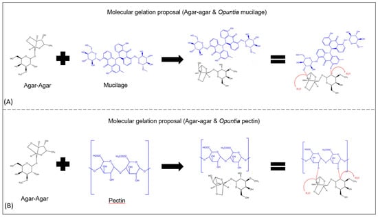 Proposal for forming covalent bonds between the molecules of the hydrocolloids extracted from the waste matter of Opuntia pads that form a gel. (A) Molecular gelation proposal for agar-agar and Opuntia mucilage. (B) Molecular gelation proposal for agar-agar and Opuntia pectin.