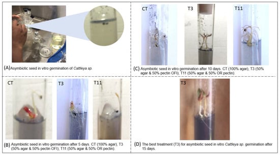 Designed Gels of the best treatments. CT (100% agar), T3 (50% agar & 50% pectin OFI), T11 (50% agar & 50% OR pectin). (A) Asymbiotic seed in vitro germination of Cattleya sp. (B) Asymbiotic seed in vitro germination after five days. (C) Asymbiotic seed in vitro germination after ten days. (D) T3 after fifteen days.