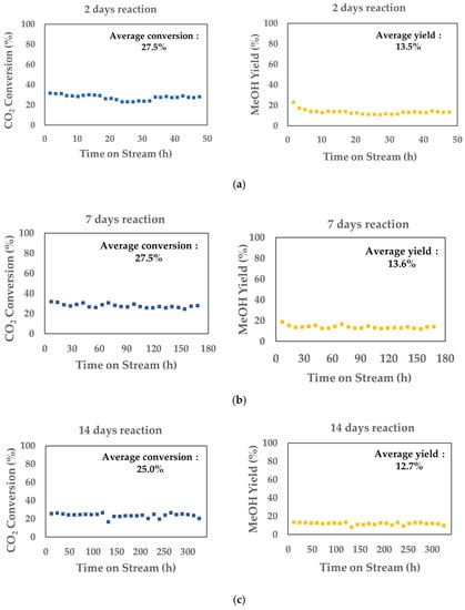 Time-on-stream plots for (a) 2 days (b) 7 days and (c) 14 days reaction.