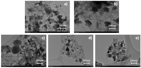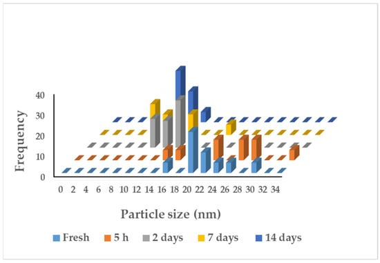 Figure 3a–e show TEM images of the catalyst samples. The average particle sizes of the samples are shown in Table 5. It shows a general decreasing trend as reaction duration increases. After 14 days of reaction, the average particle size was reduced by about 55% compared to that of the fresh catalyst. Particle size reduction was most likely the result of thermal degradation via the redispersion phenomena [20,23]. The redispersion resulted from the formation of volatile metal oxide complexes that attached to the catalyst surface which were subsequently decomposed to smaller crystallites. The particle size distribution of fresh and spent catalysts is shown in Figure 4. Reactions prolonged for up to 14 days showed significantly smaller particle size distribution, which is in agreement with the redispersion mechanism.