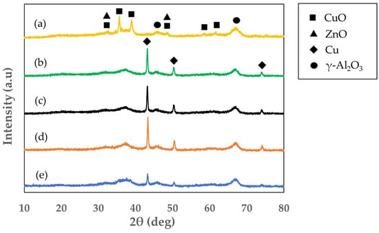 XRD analysis was used to determine the catalyst’s phase composition and crystallographic structure. Figure 6 shows the XRD patterns of the CZMNZA catalyst at different stages (fresh, 5 h, 2 days, 7 days, and 14 days). Two significant peaks of gamma aluminum oxide (γ-Al2O3) as catalyst support can be identified at 2θ of 45.90° and 67.18° [45] in fresh and all-spent catalysts, which suggested there is no phase change of gamma aluminum oxide pre and post reaction. Tenorite CuO peaks were found in fresh catalyst at 2θ 32.5°, 35.5°, 38.8°, 48.8°, 58.3°, and 61.5° [45]. Under H2 flow and reaction conditions, the peaks decrease in intensity, with the appearance of Cu (111), Cu (200), and Cu (220) peaks at 43.1°, 50.1°, and 73.7°, respectively, in all spent catalyst. Bulk crystalline CuO in a fresh catalyst is reduced to metallic Cu, an active phase for CO2 hydrogenation to methanol [46]. Nevertheless, after a reaction duration of 14 days, the peak intensity of metallic Cu was significantly diminished, which may have been caused by a change in the species of Cu [20]. This statement agreed with the change in catalytic performance after 14 days of reaction. On the other hand, zincite and ZnO diffraction peaks of fresh catalyst were observed at 32.5° and 48.8° [45], although the peaks may overlap with CuO peaks [47,48]. The ZnO diffraction peaks did not appear on the spent catalyst samples compared to the fresh catalyst. It was suggested that the metal species agglomeration occurred by blockage of CuO and ZnO surface sites under hydrogenation testing in time on stream, resulting in low catalytic activity [49].