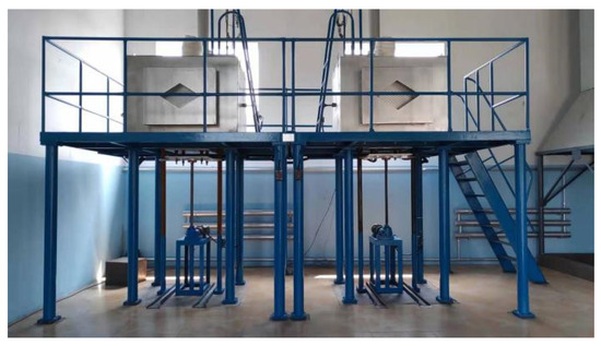 The coking test was carried out in an MHJ-40 kg (Ⅲ)-type experimental coke oven, as shown in Figure 1, which was set up in our lab. The coal loading and coke discharging of the coke oven adopt the bottom door opening method. The carbonization chamber is approximately 420 mm × 550 mm × 460 mm (L × W × H). The inner wall is integral carbonized silica brick, and the coal material is heated on both sides by silicon carbon rod heating. The maximum temperature is up to 1300 °C. Relevant test steps and results are in accordance with coal coking test method MT/T 1181-2019 from the coal industry standard of China. The specific experimental steps are as follows: First, crush the raw coal materials, and the coal samples with particle size less than 3 mm should reach 85–90%; Second, put the coal samples into the charging box and level the coal surface to make the dry basis bulk density reach 800 ± 10 kg/m3; Third, after the furnace temperature rises to 800 °C and keeps for 3 h, lift the charging box into the furnace and start to heat up. When the central temperature of coke cake reaches 950 °C and lasts for 30 min, the furnace will be discharged when the total constant temperature time of furnace wall reaches 6 h. Finally, coke samples are obtained by low moisture coke quenching.