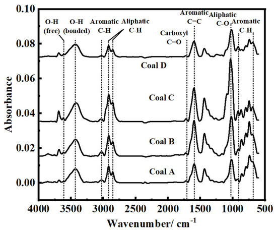 The chemical structure of the coal samples was tested by FTIR using a German Bruker-Tensor 27 infrared spectrometer. 1 mg dry coal sample was mixed with 100 mg of KBr, ground and pressed into tablets. Then, the formed tablets were put into an infrared spectrometer for testing. The characteristic peaks of carbon structure and oxygen-containing functional groups of coal in the FTIR spectrum can be divided into four regions: 900 cm−1–700 cm−1 is the bending vibration region of aromatic rings; 1800 cm−1–1000 cm−1 is the region of oxygen-containing functional groups and aromatic structures; 3000 cm−1–2800 cm−1 is the region of aliphatic carbon chain structures; 3700 cm−1–3000 cm−1 is the region of hydrogen bonds and hydroxyl groups in coal. Assuming that the carbon atoms were all aliphatic or aromatic, the following structural parameters are calculated according to the method of reported literature [25,26,27].