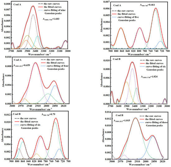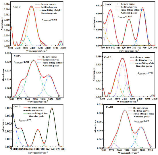 The characteristic absorption peaks in the spectra obtained by FTIR often overlap each other, so the information such as the peak height and peak area cannot be accurately analyzed. Thus, we used Peakfit sub-peak fitting software to deal with the FTIR spectra by curve fitting method in order to obtain more chemical structure information of coal samples. The fitting curves of the main functional groups belonging to the four coal samples are shown in Figure 4. The range of 3700 cm−1−3000 cm−1 represents the hydrogen bond region, and is the peak area of the hydrogen bond region. The hydrogen bond composed of hydroxyl-OH has great influences on the cohesion and coke ability of coal. The range of 900 cm−1−700 cm−1 represents the aromatic ring substitution region. The higher the peak area of , the higher proportion of substituted aromatic rings is in coal structure. Taking coal A as an example, the curve in the range of 3700 cm−1–3000 cm−1 was fitted and divided according to the Gaussian algorithm, and nine Gaussian peaks were obtained. Parameters such as peak area, peak height, and half-peak width of each sub-peak were also obtained, then and were calculated. For the 900−700 cm−1 region of aromatic ring bending vibration, five Gaussian peaks and the corresponding parameters were obtained, then was calculated. For 3000 cm−1−2815 cm−1 region of aliphatic stretching vibration, four Gaussian peaks and the corresponding parameters were obtained, and can be obtained. According to the results of Peakfit and the formula in Section 2.3, the chemical structure parameters of the coal samples were listed in Table 6.