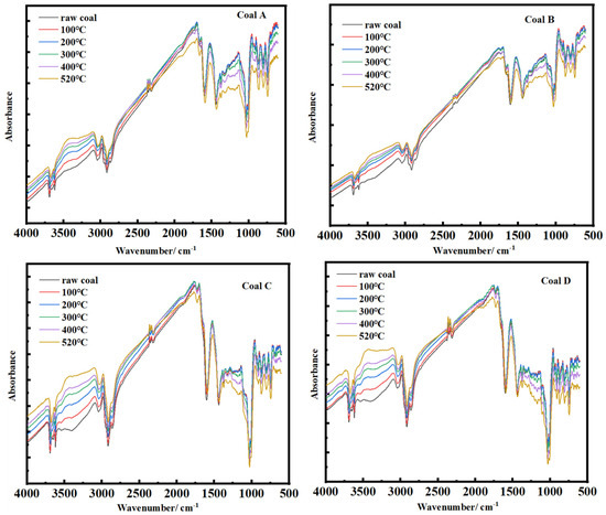 In addition, the chemical structure changes during thermal transformation were studied by the in-situ FTIR (Thermo Scientific Nicolet iS50, Waltham, NJ, USA) combining with the infrared spectra of the coke samples obtained from a 40 kg coke oven. The test conditions were as follows: from room temperature to 520 °C, the heating time was 100 min, and the data were collected at intervals of 0.5 min.