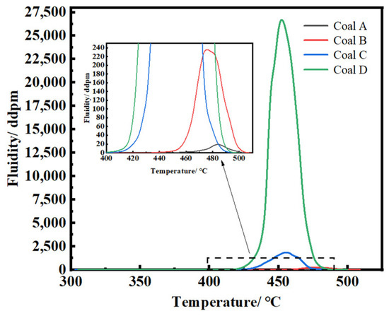 Gieseler fluidity was used to characterize the fluidity characteristics of coking coals. The initial softening temperature (IST), maximum fluidity temperature (MFT), resolidification temperature (RST), fluidity temperature range (FTR) and maximum fluidity (MF) were shown in Table 7 and Figure 7. From coal A to coal D, the initial softening temperature of coal samples become lower and the maximum fluidity become higher. The maximum initial softening temperature of coal A is 453 °C, which means that coal A begins to flow only at higher temperature, and the plastic temperature range is narrow. Thus, the active substances in coal A do not have sufficient time and space to interact with the inert substances and fuse, resulting in the lower thermal strength of coke A. It is noted from Table 1 that G value of coal A and coal B is close, but the fluidity curve and range of coal B differs greatly from that of coal A in Figure 7, implying that caking index G can only reflect the viscosity of plastic mass. The narrower plastic range and smaller maximum fluidity result in poor fusion of plastic mass and inertinite, which lead to low thermal strength of coke. Similarly, the G values of coal C and coal D are very close (as shown in Table 1), and their plastic temperature ranges are also close. Although the maximum fluidity of coal D is ten times higher than that of coal C, the CSR of the corresponding coke is both higher than 60% shown in Table 2, and the thermal strength of coke is good. Therefore, it is necessary to comprehensively analyze the caking index, plastic temperature range and maximum fluidity of coal to determine its influence on coke quality. According to the Gieseler fluidity parameters of the four coking coals, the initial softening temperature of coal D is the lowest, the plastic range is the widest, and the thermal strength of coke made from coal D is the best. Therefore, according to the above results, when the initial softening temperature is lower than 400 °C and the plastic range is higher than 100 °C, high-quality coke can be obtained.