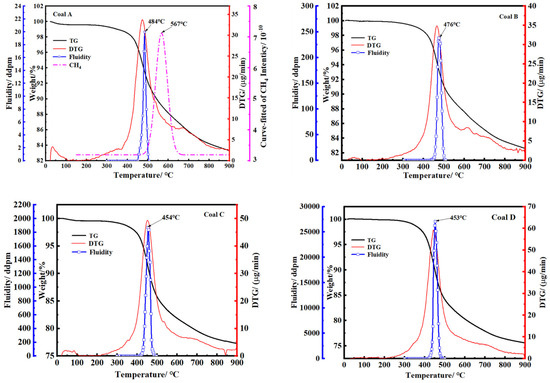 TG-MS was used to analyze TG, DTG and CH4 evolution during the heating process of coal samples. The results are shown in Figure 8. It can be seen that the maximum weight loss rate of coal A is lower than that of coal B, coal C and coal D, and the temperature corresponding to the maximum weight loss of coal A is the highest, which shows that the activation energy required for the fracture of aliphatic hydrocarbon side chain and oxygen-containing functional group of coal A is high. That is to say, the volatile matter released from coal A during pyrolysis mainly comes from the covalent bond with higher bond energy, which indicates that the chemical bond of coal A is more stable than other coals. CH4 generated during coal pyrolysis is from the polycondensation of methyl, aliphatic side chains or aromatic ring compounds in coals. The initial temperature of hydrogen evolution is about 300 °C, and the generation of hydrogen is related to the C=O, H/C and O/C. From the fitting curve of CH4 in the gas mass spectrum, it is found that coal A pyrolysis and generates CH4 at about 500 °C, and releases the most CH4 at 567 °C. It is inferred that CH4 may be formed by secondary pyrolysis of hydrogen ions and aliphatic hydrocarbons, or formed due to methyl groups are broken from aromatic systems at higher temperature.