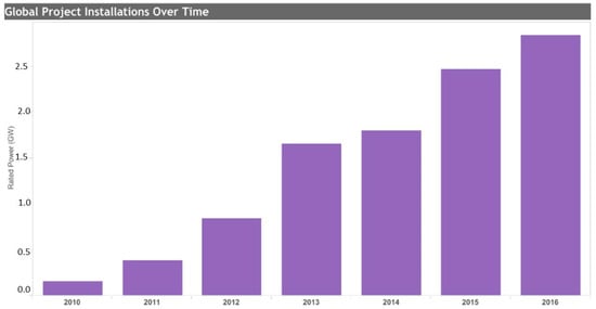 The CSP sector is currently a driver in TES applications because new power plants in operation or under construction are equipped with short-term heat storage systems, mostly based on the molten salt SH-TES. There is no doubt that this is the most significant development for large, centralized TES systems [73]. The use of concrete-based material is attractive due to its simplicity and low cost. The LH-TES and TCS systems, instead, represent the upcoming future of thermal storage; TCS is suitable for long-term seasonal storage, which may improve the operational continuity for variable renewable technologies and reduce their energy production costs. Lead players in the current thermal energy storage market include Abengoa Solar, Areva, Baltimore Aircoil Company, BrightSource Energy, Caldwell Energy, Calmac, DN Tanks, Evapco, Ice Energy, EnergyNEST, SolarReserve, Sunwell Technology, and others. At the global market, databases of TES are provided by US-DOE Global [74]. Figure 3 shows the global TES capacity equal to 2.85 GW for all European countries, based on 161 projects, with a growing trend between 2010 and 2016. Spain is the first country in terms of molten-salt TES applications connected to the CSP plants. The total power installed is attested to 1.13 GW related to 26 projects.