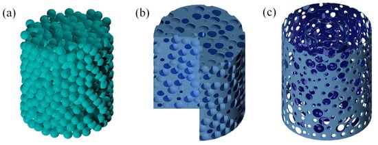Under the same packing conditions as the CT test, a randomly packed bed was achieved using the DEM method shown in Figure 6a. The extracted pore model of the filler structure can be seen in Figure 6b. Radial porosity was characterized as a structural property of the packing system with values ranging from 0 to 1. The radial pore structure model (Figure 6c) was obtained by Boolean operations using spherical particles and radial annular cylindrical layers. The distribution of radial porosity (εr) can be obtained by calculating the percentage of pores in each radial annular cylindrical layer. The calculation formula is as follows: