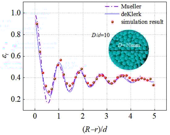 The data calculated by the above equation were compared with the radial porosity distribution calculated using the Mueller and de Klerk empirical formulas [44,45]. The relative error δεr between the two was calculated by the following formula: