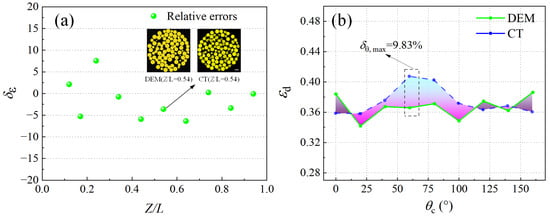 The relative error between the two groups of pore fractal dimension (δf) at different rotational sections was calculated and is presented in Figure 9c, and the maximum value is less than 1%. This shows that the packed structure constructed using DEM has similar complexity and fractal structure to the practical randomly stacking structure of particles.