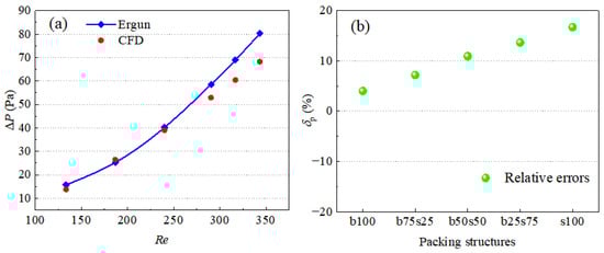 To verify the stability of the packing model under different Reynolds numbers (Re), a comparison of the pressure drop (ΔP) in packed bed b100 was made for the results obtained from the DEM-CFD model and the Ergun equation, respectively, as shown in Figure 10a. It can be seen from Figure 10a that the two groups of data are in good agreement. However, the difference between the CFD results and the Ergun results increases as the Reynolds number exceeds 301.3, and the maximum relative error between the two groups of results reaches 14.9% at Re = 356.1. In addition, under the same inlet velocity (uinlet = 0.8 m/s), the effect of packing structure characteristics (b100, b75s25, b50s50, b25s75 and s100) on the relative error of the pressure drop between the simulated results based on the DEM-CFD model and the data calculated by the Ergun equation is presented in Figure 10b. As can be seen from Figure 10b, all the relative errors for the five packing beds are within 17.0%, indicating the simulated results obtained from the five groups of filler models are reliable.