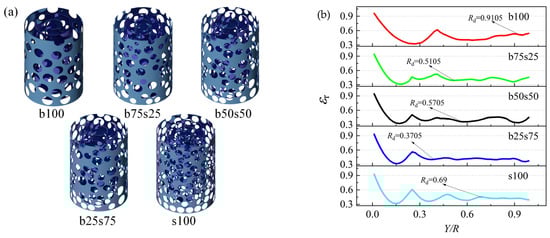 (2) The radial porosity distributions of the five constructed stacking models were compared. The results show that b25s75 has the shortest oscillation distance near the wall, and the dimensionless distance of radial porosity fluctuation from the wall is 0.3705, proving that the wall effect on this stacking structure is minimal.