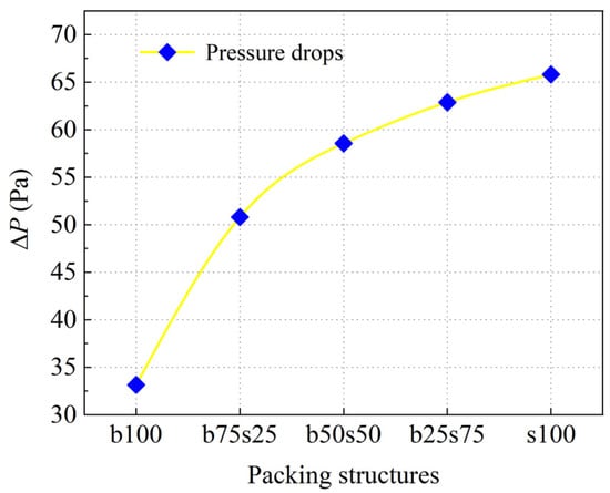 The distribution of fluid flow pressure drop (ΔP) in the five packed beds is shown in Figure 12. Fluid flow in a packed bed is hindered by the presence of packing particles. In order to overcome this resistance, energy loss will occur, resulting in a decrease in pressure. Hence, the packing arrangement is important for packed bed pressure drop. In Figure 12, packed bed b100, composed of single large particles, shows the lowest pressure drop. As the mass ratio of small particles increases from 0:1 to 0.33:1, the pressure drop increases obviously. However, as the mass ratio of small particles exceeds 1:1, the effect on the pressure drop is not significant. This shows that the binary composite packing structure may offer the advantage of a longer interaction time between the fluid flow and solid particles, which is beneficial for packed beds with gas–solid reactions. It can be seen from Figure 11a and Figure 12 that b50s50 has a small optimization degree for both radial porosity and pressure drop of the packed bed. Therefore, the four typical packing structures of b100, b75s25, b25s75 and s100 were selected for further discussions about flow characteristics and heat transfer.