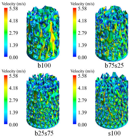 The 3D velocity distributions in the four packed beds of b100, b75s25, b25s75 and s100 are shown in Figure 13 under the same conditions of inlet velocity (uinlet = 0.8 m/s). For packed bed b100, high velocity and an obvious short circuit phenomenon near the side walls can be observed in Figure 13, meaning much fluid flows through the packed bed near the border. For the binary composite packing structures, it can be seen from the figure that with an increase in the mass ratio of small particles, the fluid short circuit and local inhomogeneity are inhibited gradually, and packed bed b25s75 shows a similar homogeneity of 3D velocity distribution to packed bed s100. As the wall effect has a pronounced influence on the flow inside a packed bed with a low tube-to-particle diameter ratio [49,50], the control of this is of great significance to improve the efficiency of the packed bed reactor.