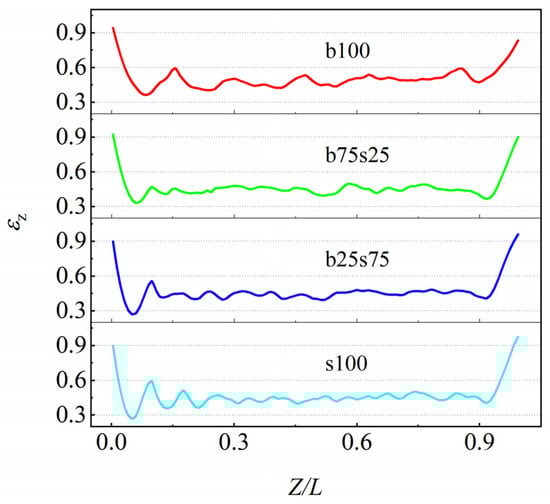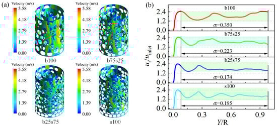 The average velocity distributions along the radial direction of the four packed beds are shown in Figure 14 at the same inlet velocity of 0.8 m/s. As can be seen from Figure 14b, corresponding to the radial porosity distribution in Figure 11b, the radial velocity distribution also shows an oscillatory behavior, but the two groups of curves show a strong negative correlation. That means a higher velocity occurs at a lower porosity in the packed bed (see Figure 14a). Comparing the four curves in Figure 14b, the standard deviations (σr) of the radial distribution curves in packed bed b25s75 is about 0.174, which is smaller than that of packed beds b100 (0.350), b75s25 (0.223) and s100 (0.195). Thus, the fluid velocity of the packing structure of b25s75 is less affected by the wall effect, and the radial distribution of velocity in packed bed b25s75 is more uniform, which is conducive to the optimal design of a packed bed with gas–solid interaction.