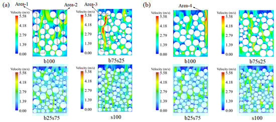 Figure 18 compares the velocity distribution clouds at the axial cross sections (section-4 and section-5) in the four stacking structures of b100, b75s25, b25s75 and s100. As shown in Figure 18, larger pore channels (see the selected areas 1, 2, 3 and 4) can be observed in the packed beds of b100 and b75s25 due to the looser particle accumulation, resulting in poor uniformity of the accumulation. The selected areas 1 and 3 of connected channels in Figure 18a exist almost from the inlet to the outlet of packed beds b100 and b75s25, producing obvious gully flow phenomena during the fluid flow process, which may reduce the utilization efficiency of feeding gas and inhibit the heat transfer between fluid flow and solid particles. In addition, fluid short-circuiting (selected area 4 in Figure 18b) occurs at the wall of packed bed b100, with a sudden increase in the velocity of the fluid. This uneven flow rate distribution will make the gas–solid interaction inadequate in the bed, which is not conducive to applying packed beds with catalytic or heterogeneous particles.