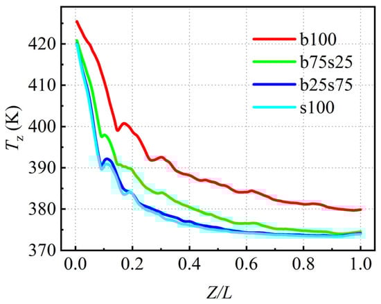 Most of the reactions in the packed bed are high-temperature catalytic reactions [51]. Therefore, it is necessary to discuss the effect of packing structure characteristics on temperature distributions and heat transfer efficiency in the packed beds. Figure 19 shows the axial temperature (Tz) distributions of fluid flow in different packed beds. Under the same initial conditions, the temperature fields of fluid flow in packed beds b25s75 and s100 are similarly lower than packed beds b100 and b75s25, indicating a higher heat transfer efficiency between the fluid flow and solid particles can be achieved in packed beds b25s75 and s100.