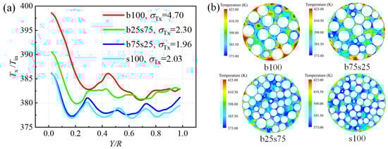 Figure 20 shows the radial temperature (Tx) distributions in the four packed beds of b100, b75s25, b25s75 and s100 under the same initial conditions. It can be observed from Figure 20a that the temperature distributions of the fluid flow near the wall all increase obviously in the four packed beds. Since the contact area between the particles and the fluid in the near-wall region is less than that of the internal particles, the heat transfer efficiency is reduced, resulting in a relatively high fluid temperature near the wall, especially for packed beds b100 and b75s25. In addition, the lower flow velocity and the retention phenomenon near the wall are also factors that affected the temperature distribution. It should be noted that the influence of this wall effect on the homogeneity of the temperature profile along the radial direction decreases with the increasing mass ratio of small particles. Figure 20b compares the 2D temperature distributions at the radial cross sections of Z/L = 0.23 in different stacking structures. As shown in Figure 20a, the homogeneity of radial temperature distribution in packed beds b25s75 and s100 is significantly higher than that of the other packed beds, and the standard deviation of the temperature distribution curve in packed bed b25s75 is the smallest (about 1.96), meaning that the introduction of a suitable binary composite packing structure is conducive to the radial uniformity of the temperature field. Combined with the results in Figure 19, it can be concluded that the packing structure of b25s75 is more favorable for the improvement in both heat transfer efficiency and the uniformity of temperature field in packed beds.