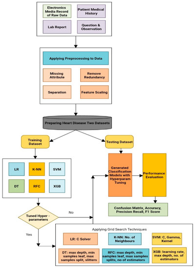 In this study, two stages of heart disease predictions were taken into account. Figure 1 shows the flow chart for diagnosing the traditional form of heart disease. This model was not described using a hyperparameter tuning technique for a classification algorithm [30]. Six distinct machine learning algorithms are displayed for both the conventional models and the suggested techniques depicted in Figure 1. These six suggested models were then used to examine the testing dataset and evaluate the accuracy of the results. One of the most crucial components in machine learning is hyperparameter tuning. If the hyperparameters are tuned, the ML algorithms will perform more efficiently. The ideal settings for the hyperparameters can be found by conducting a thorough search, such as GridSearchCV.