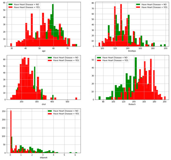 The number of main blood vessels (0–3) colored using fluoroscopy was based on the principle that continuous blood circulation makes the heart better. Then, for simplicity and improved comprehension, the histogram of categorical and continuous characteristics is shown in Figure 3. For the structure and frequency range of continuous and categorical observations, histogram charts display the distribution of each characteristic value.