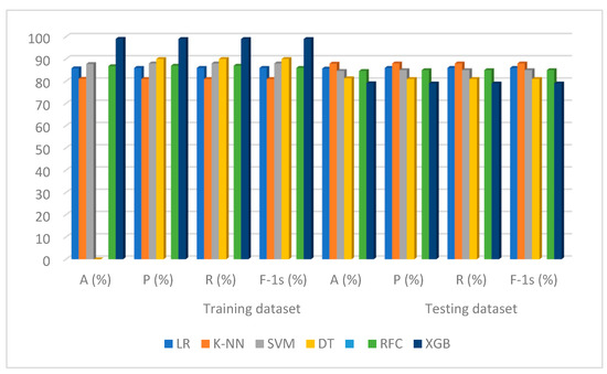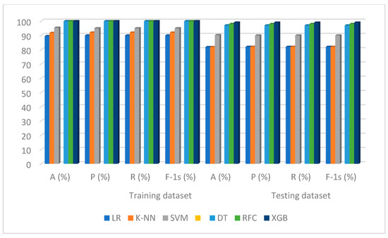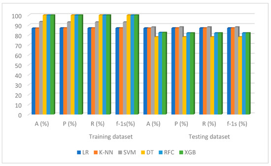 The default settings were used when applying the ML algorithms in this experiment. The results of the system are shown in Figure 5. The accuracy, precision, recall, and F-1 score of the model were found to be 86.79%, 87%, 87%, and 87%, respectively, during the fitting and running phases of the LR training phase. The accuracy, precision, recall, and F-1 score for the test dataset that this LR predicted were 86.91%, 87%, 87%, and 87%, respectively. Again, during the training phase, the K-NN model was run with the parameters’ “uniform” weights and the number of neighbors (K) = 5, and it produced an accuracy, precision, recall, and F-1 score of 86.79%, 87%, 87%, and 87%, respectively. The accuracy, precision, recall, and F-1 score for this K-NN model, which predicted the test set, were 86.81%, 87%, 87%, and 87%, respectively. The performances of the SVM for training in terms of the accuracy, precision, recall, and F-1 score were 93.40%, 93%, 93%, and 93%, respectively, using the settings of kernel = RBF, gamma = 0.1, and C = 1.0. The accuracy, precision, recall, and F-1 score of the test dataset for the SVM were 87.91%, 88%, 88%, and 88%, respectively. The DT ran the model with random_state = 42 parameters for training datasets; the results indicated 100% accuracy, precision, recall, and F-1 score. The accuracy, precision, recall, and F-1 score for the test dataset produced using the DT were 78.02%, 78%, 78%, and 78%, respectively. The RFC ran the model with n_estimators = 1000 and random_state = 42 parameters for the training datasets; the results showed 100% accuracy, precision, recall, and F-1 score. The accuracy, precision, recall, and F-1 score for the test dataset produced using the RFC were 82.02%, 82%, 82%, and 82%, respectively.